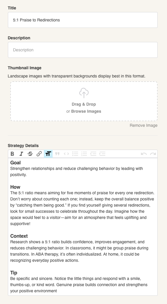 Strategy Details — a rich text editor containing the Goal, How, Context, and Tip sections. Use the formatting toolbar (bold, italic, lists, etc.) to edit each section.