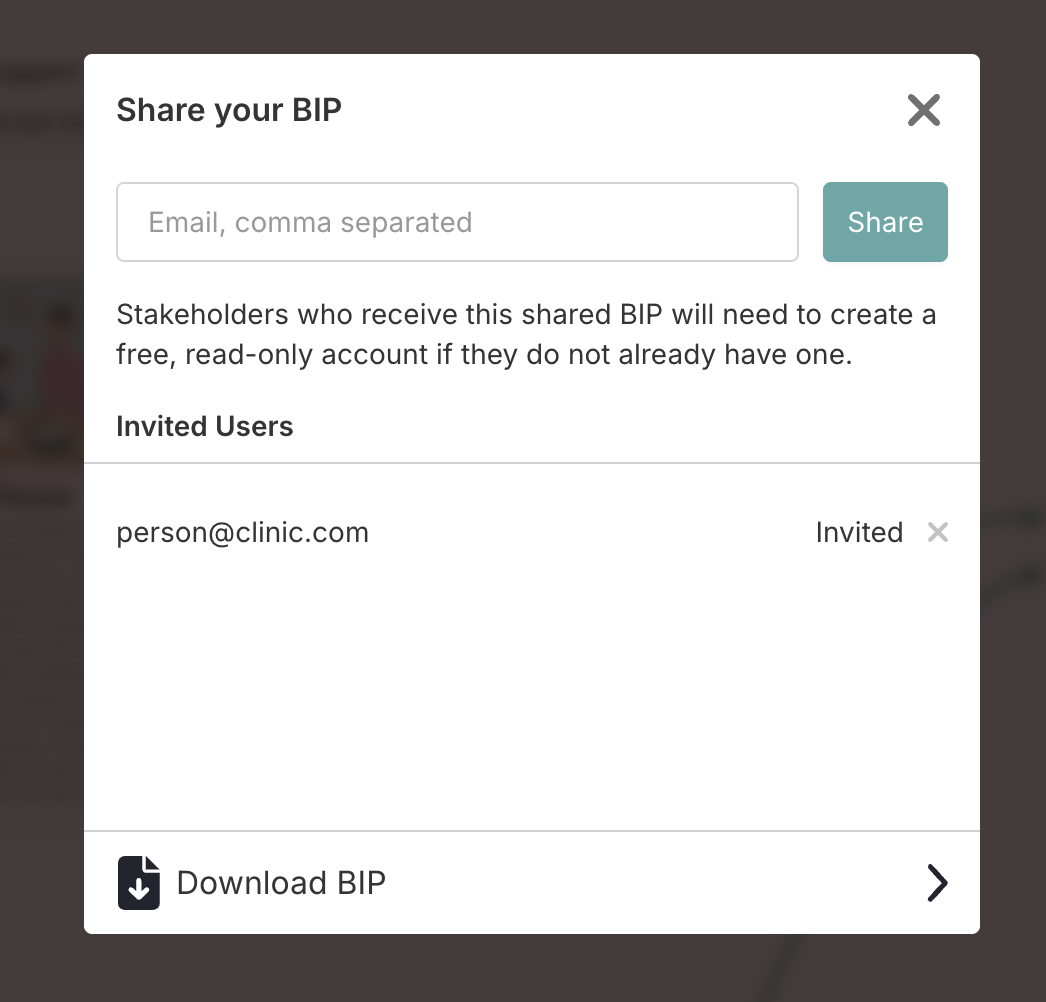 Enter the team member's email address and click Share. They receive an invitation to view the full BIP, including all customized strategy cards, in Present Mode.