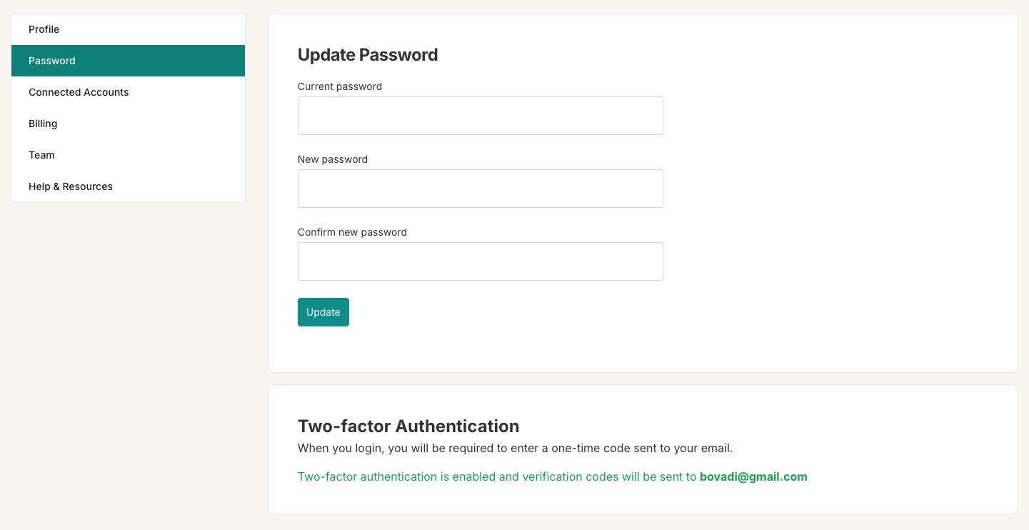 You can update your account password at any time from the Password settings page. Your current password is required to confirm the change.