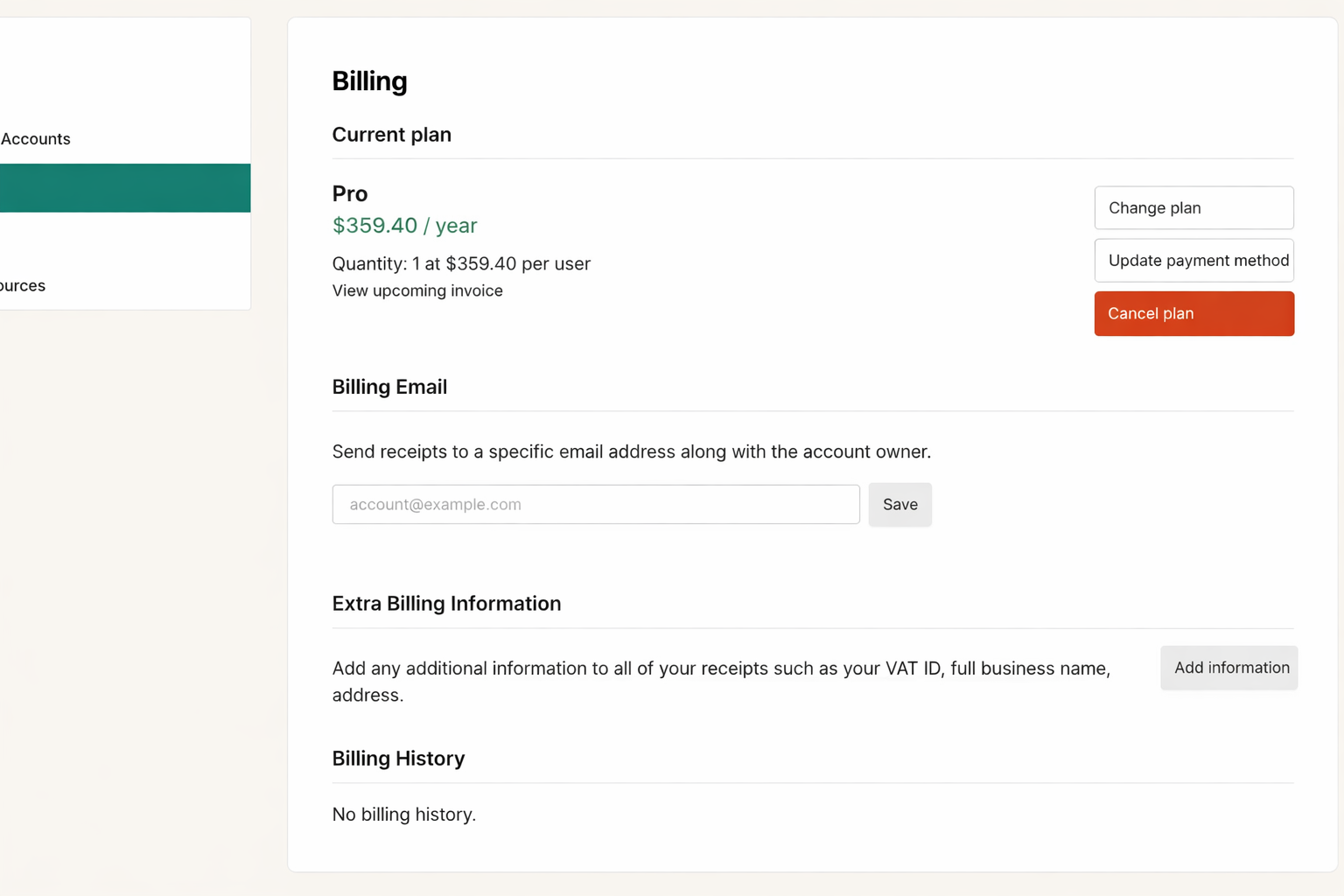 Current plan — shows your active subscription (plan name, price, and number of seats). If your plan has been cancelled, the end date is shown here along with a Resume plan link to reactivate it. Click View upcoming invoice to preview your next charge.