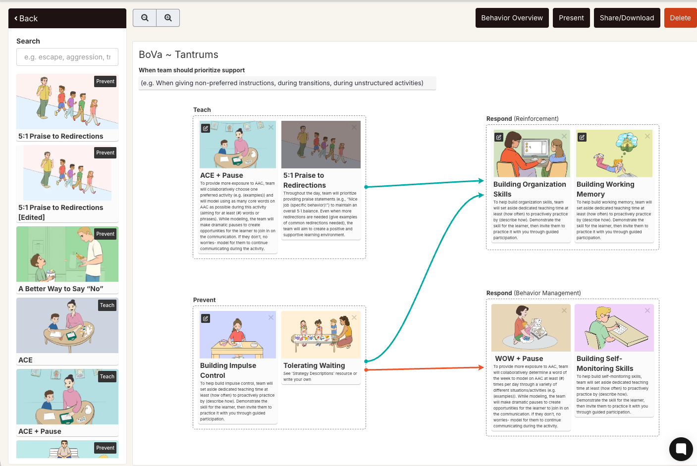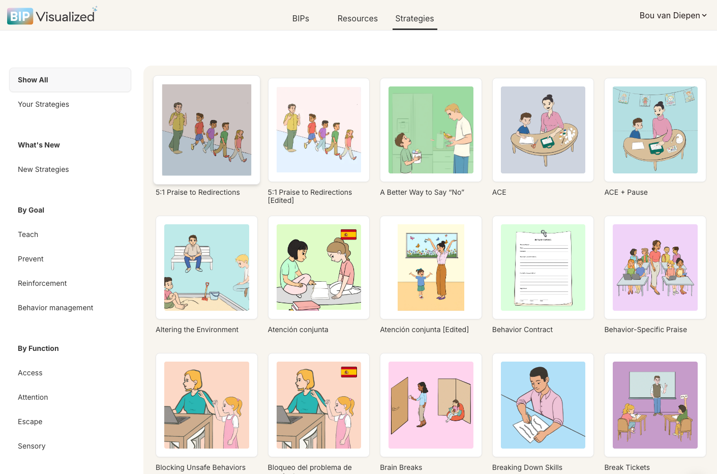 Browse the card grid. Use the left sidebar to filter by goal type — Teach, Prevent, Reinforcement, Behavior Management — or view Your Strategies to see your saved custom versions.